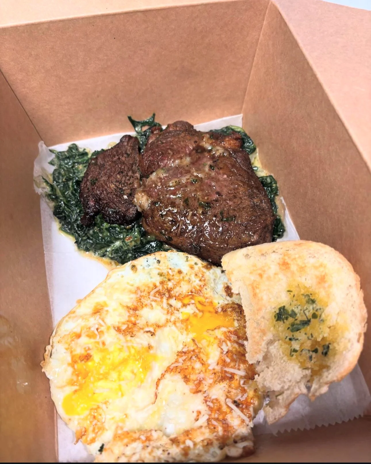 Menu › Garlic butter & Herb Steak Image 1 of 1 Garlic butter & Herb Steak $16.00 Garlic butter & Herb steak over creamy spinach served with 2 over-easy eggs Quantity: Add To Cart Added! Garlic butter & Herb steak over creamy spinach served with 2 over-easy eggs