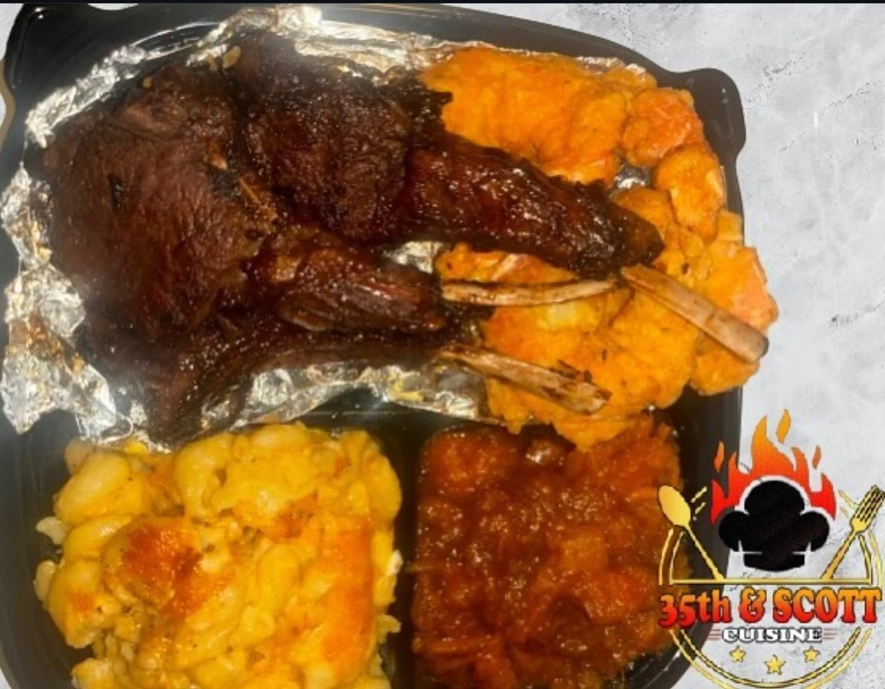 Menu › Land & Sea Image 1 of 1 Land & Sea $35.00 3 pieces of Lamb and 4 pieces of jumbo fried shrimp.Served with yellow rice and 2 sides of your choice. Side 1: Select Side 1 Green Beans Potato Salad Mac N Cheese Sweet Potatoes Greens Side 2: Select Side 2 Green Beans Potato Salad Mac N Cheese Sweet Potatoes Greens Quantity: Add To Cart Added! 3 pieces of Lamb and 4 pieces of jumbo fried shrimp.Served with yellow rice and 2 sides of your choice.